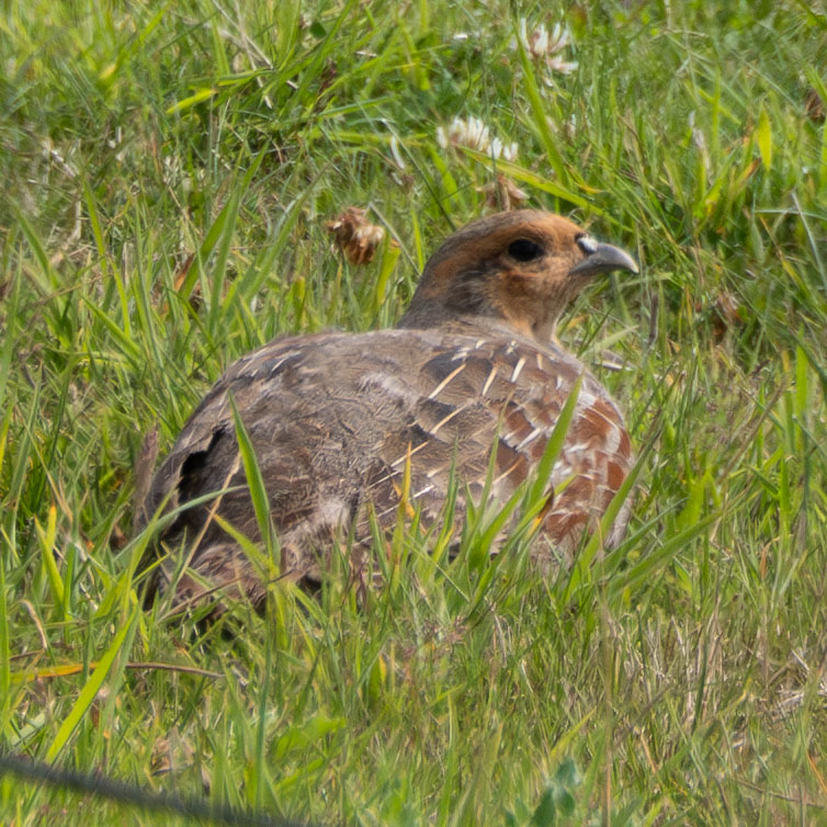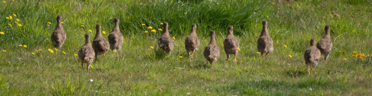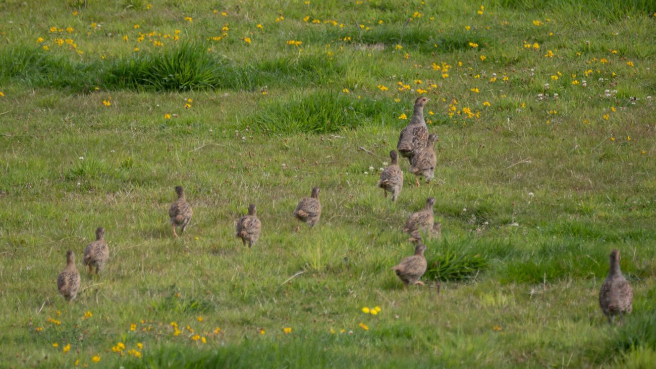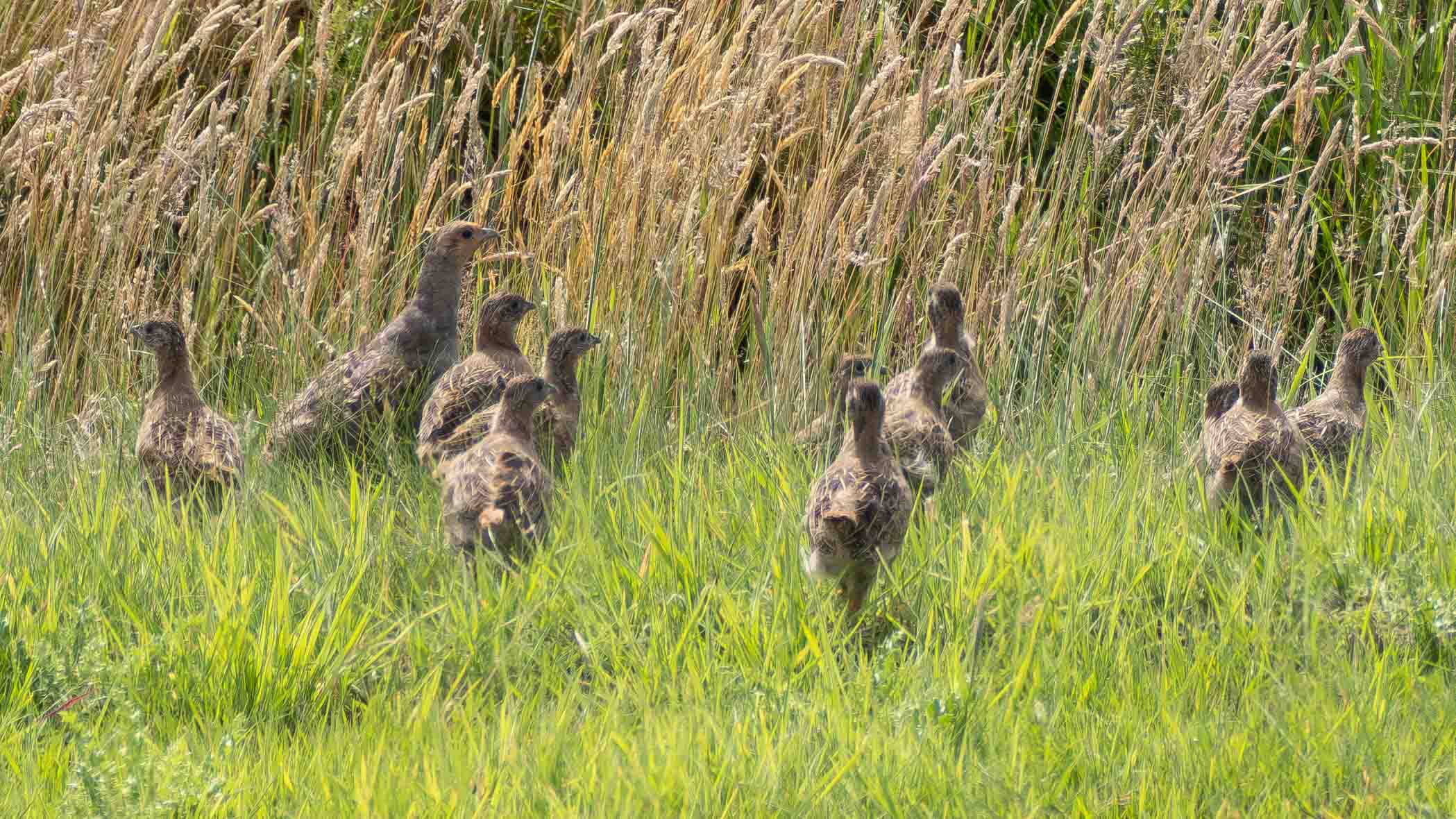 De trotse volwassen patrijzen stonden als beschermers aan de zijde van meer dan tien mooie kuikens. Deze kleine vogels waren druk in de weer met het verkennen van hun kruidenrijke omgeving, waar het gras niet alleen een smakelijke maaltijd bood, maar ook een veilige schuilplaats tegen eventuele bedreigingen.