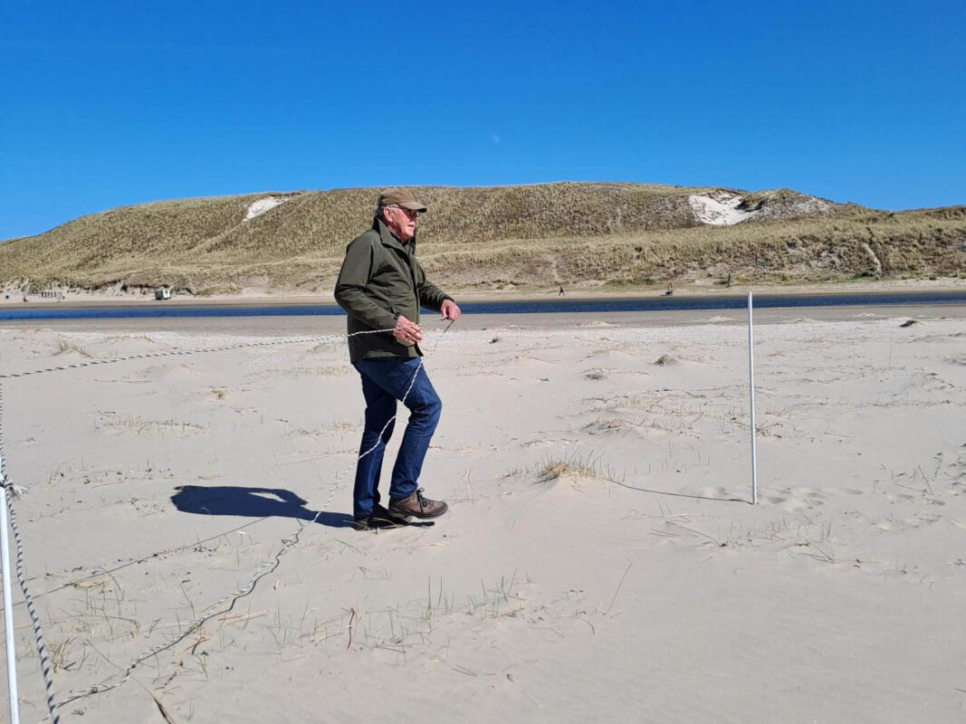 Het reguliere beschermingsmateriaal voor de strandbroeders was nog niet beschikbaar. Een spoed/noodoplossing was gewenst en noodzakelijk gelet op het vele publiek. Collega’s vogelwachters werden ingeseind. Bij een omwonende werden weidepaaltjes georganiseerd met afzet draad. Een provisorische oplossing voor het eerste broedsel van de Bontbekplevier was vlot gerealiseerd.