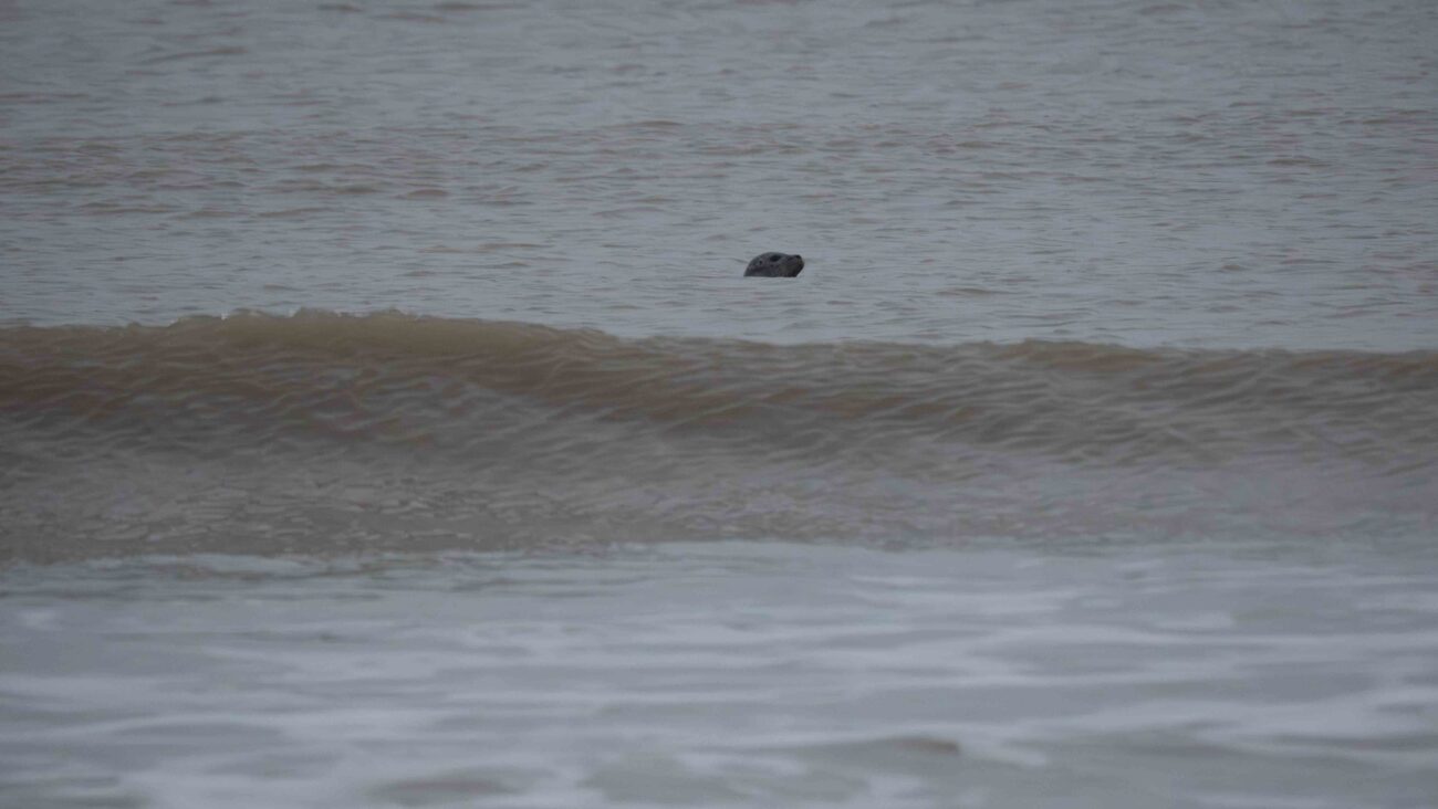 Een gewone zeehond dook op in de branding en hield de eenzame strandbezoeker gezelschap.