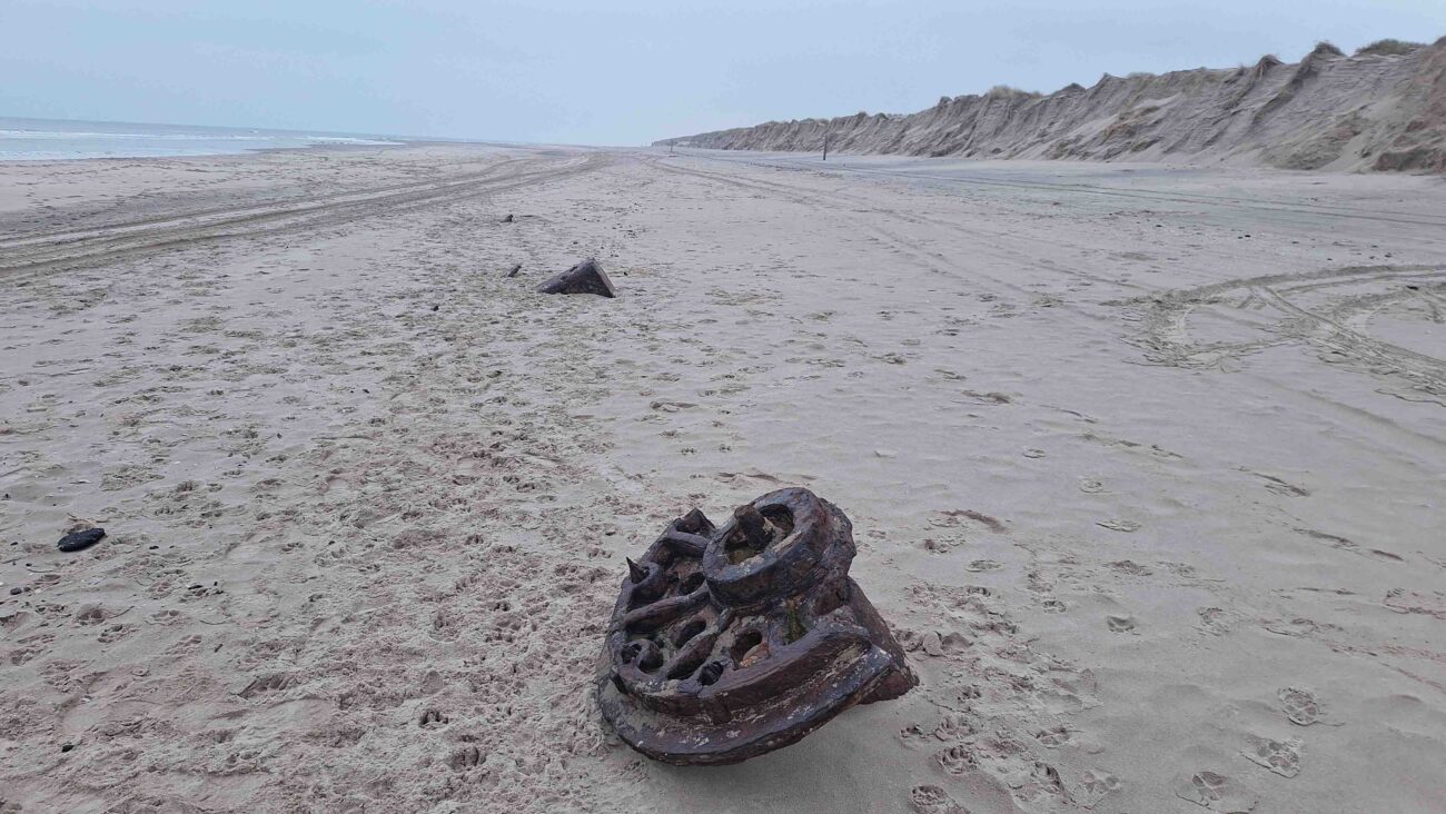 Vandaag gaf de HMS Prince George zich weer een stukje verder bloot. Het in 1921 vergane slagschip toonde ditmaal vier zware ijzeren delen die trots boven het zand uitstaken—een herinnering aan de kracht van de zee.