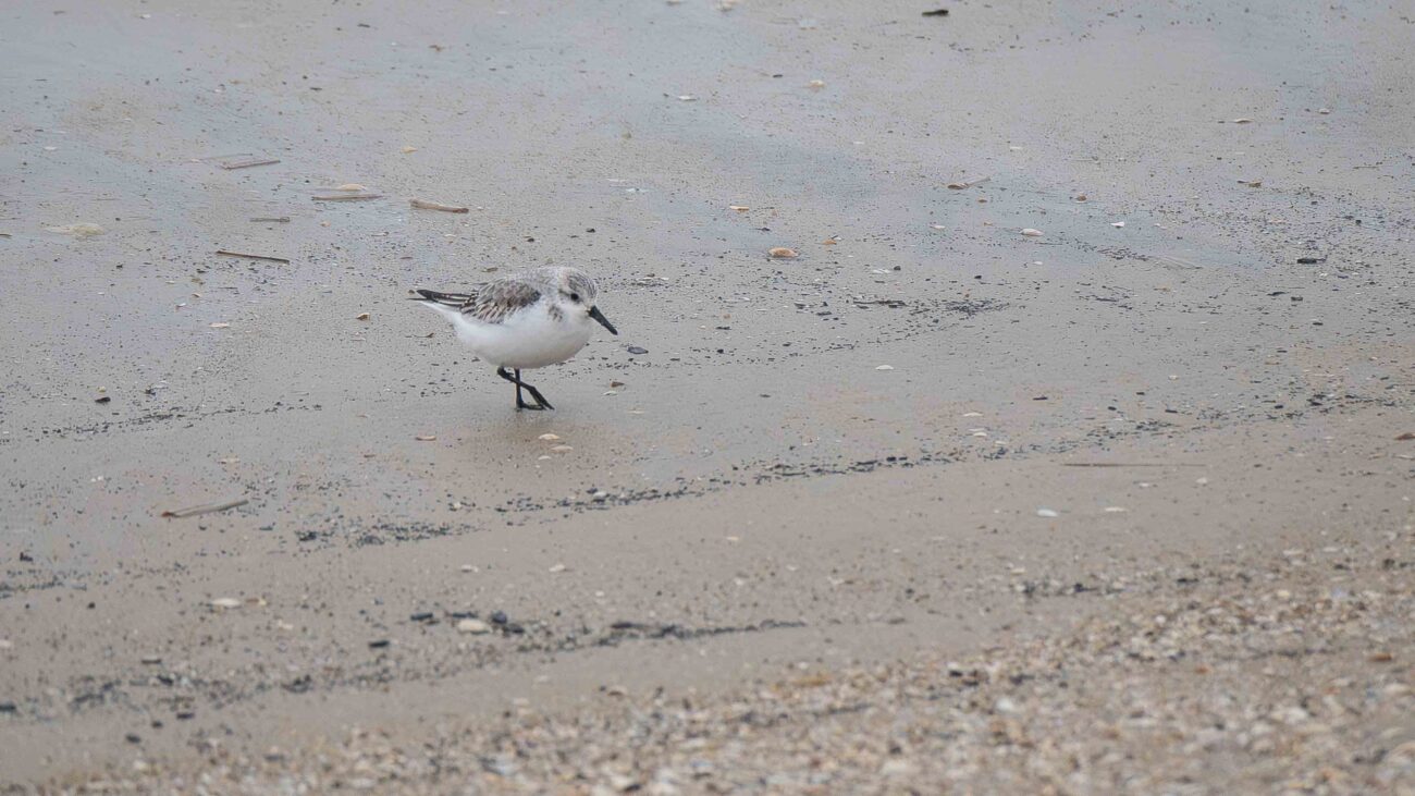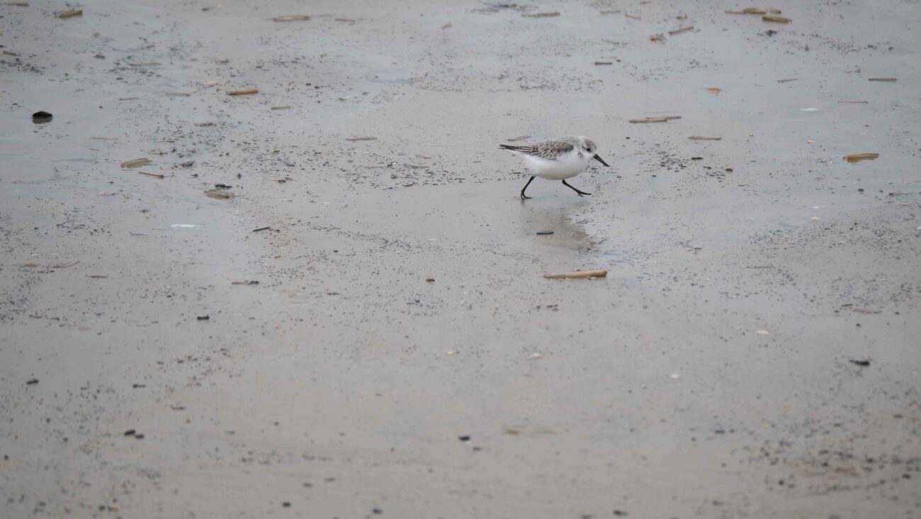 Terwijl de embryonale duinen werden getergd door wind en water, scharrelden de drieteenstrandlopers onverstoorbaar langs de waterkant. Het gewenste licht voor de fotografie is zeer beperkt beschikbaar maar tekent wel de sfeer.