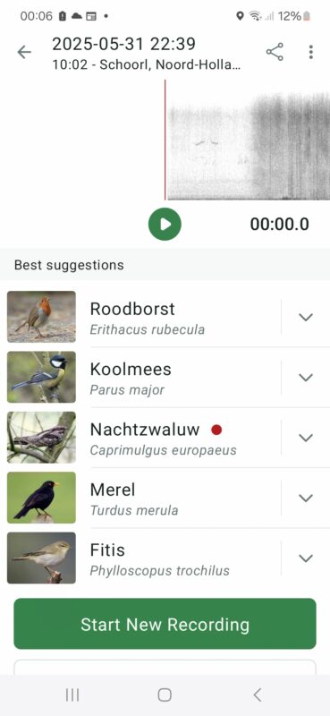 De zon was ruim een half uur onder en de specifieke baltsgeluiden waren goed waarneembaar. De Merlin app ondersteunde de waarneming op deze spannende belevenis voorafgaande aan de nacht. De vliegbewegingen werden uitgevoerd in een straal van 50 meter rond een alleenstaande dennenboon in een heideveld, waar de onderste kale taken werden gebruikt als zitplaats.