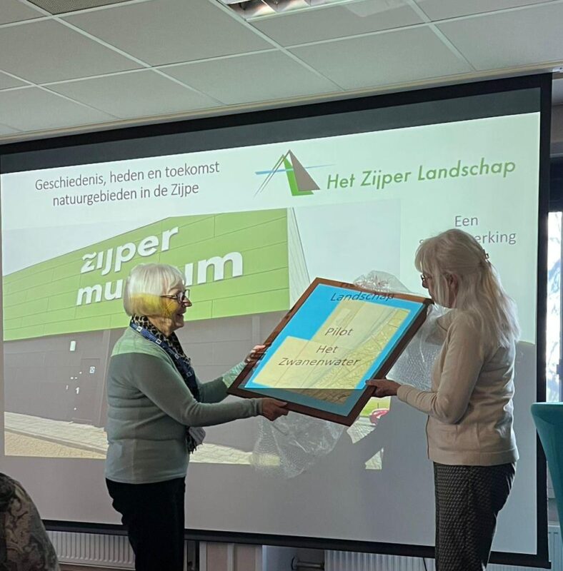 De ochtend werd afgesloten met een symbolisch gebaar: Het Zijper Landschap schonk twee fraai ingelijste, historische landkaarten van Groote Keeten en het Zwanenwater aan het museum.