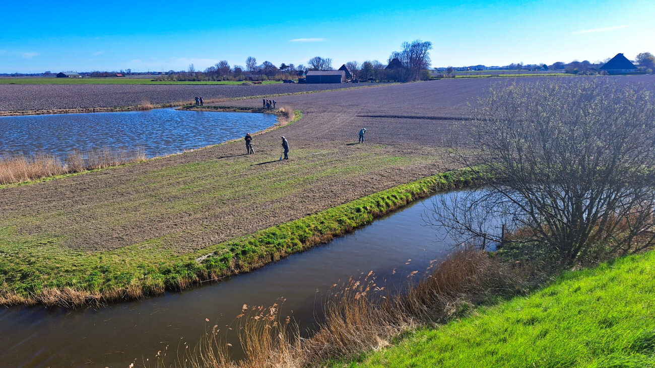 Na een korte introductie van de coördinatoren Maaike en Trees werden de groepen samengesteld: die van het water, de grond en de vogelwaarneming. De 4 hectare grote akker is inmiddels ingezaaid met een bloemenmengsel en de zogenaamde keverbank is eveneens aangelegd. Onder de stralende zon werd het Pronkstuk van diverse invalshoeken nader bekeken door de 14 aanwezige vrijwilligers. De schop en de emmer maar ook de verrekijker werden met enthousiasme ter hand genomen.