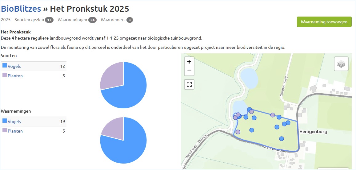 De resultaten werden waar mogelijk direct ingevoerd op de app van waarneming.nl, die voorzien is van een zogenaamde ‘Bioblitz’ (gemarkeerde digitale afbakening van het perceel)