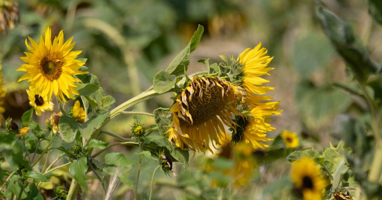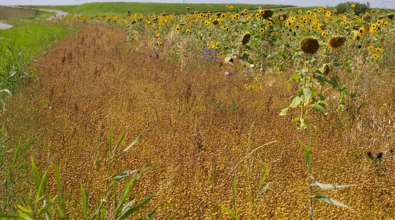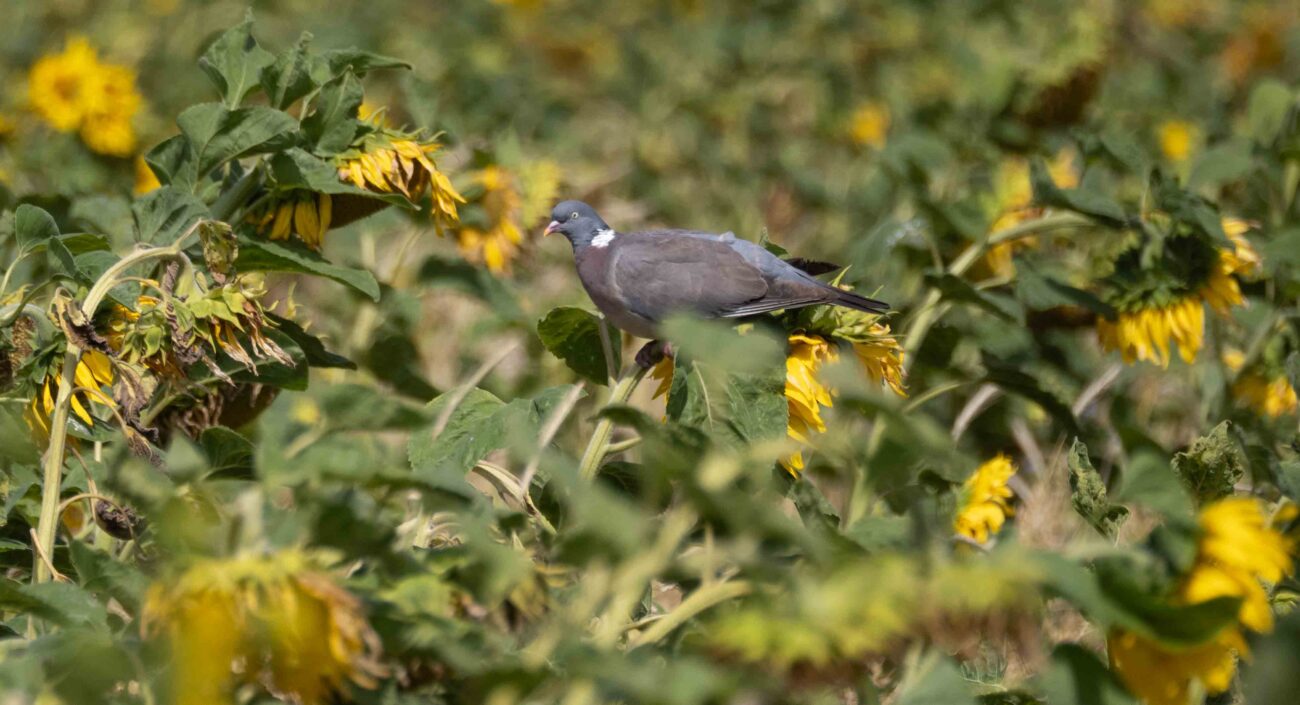 Wat een gezellige en kleurrijke scène! Op de laatste dag van juli 2025 zie je een grappig gezicht: een houtduif die heerlijk op een zonnebloem zit te zonnen. Het zonnebloemveld biedt de natuur zoveel moois en mogelijkheden. Hoewel de vrolijke Putters, ook wel zaakvinken genoemd, die graag de zaden uit de bloemen halen, nog niet te zien zijn, is dat waarschijnlijk slechts een kwestie van tijd. De zonnebloemen en andere kleurrijke planten rijpen snel en maken zich klaar voor de oogst. Ook het vlas is inmiddels rijp en zal binnenkort geoogst worden. Het is echt een prachtige tijd van het jaar, vol leven, kleur en natuurlijke schoonheid!
